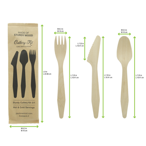 Kit posate in legno 3/1: coltello forchetta cucchiaio, involucro kraft